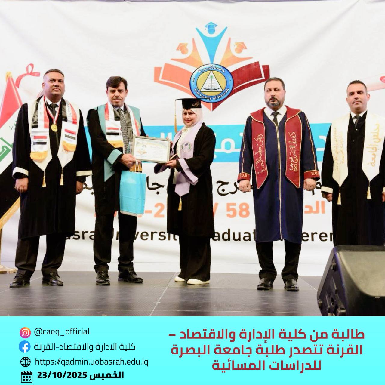 طالبة من كلية الإدارة والاقتصاد – القرنة تتصدر طلبة جامعة البصرة للدراسات المسائية