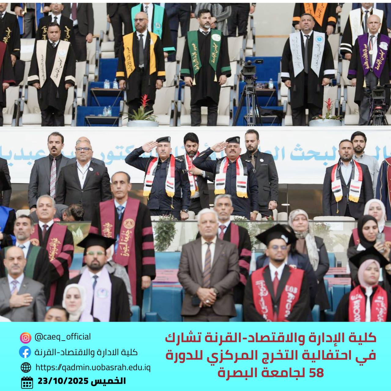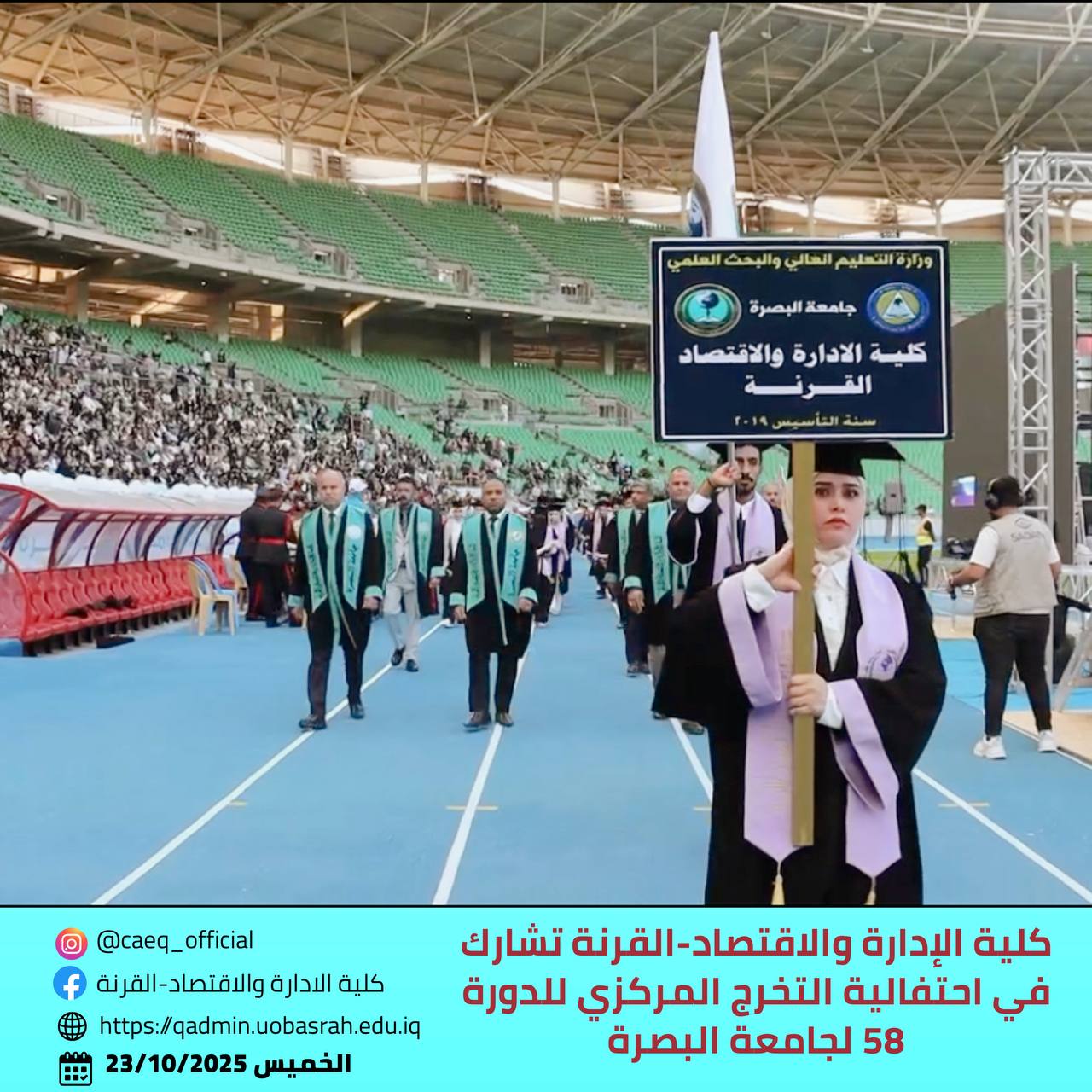 شاركت كلية الإدارة والاقتصاد – القرنة في احتفالية التخرج المركزي للدورة (57) الموسومة بـ (دورة الإبداع والتميز)، والتي أُقيمت بتاريخ 23 تشرين الأول 2025 في مدينة البصرة الرياضية.