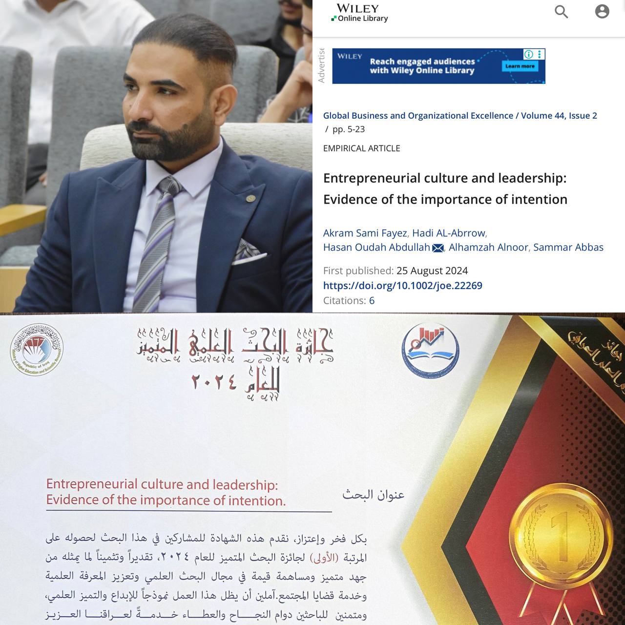 حصل بحث التدريسي الدكتور حسن عودة عبدالله بالتعاون مع باحثين اخرين والموسوم “Entrepreneurial culture and leadership: Evidence of the importance of intention” على المركز الأوّل ضمن جائزة يوم العلم العراقي للبحث العلمي المتميّز لعام 2024 التي تمنحها وزارة التعليم العالي والبحث العلمي. ويعكس هذا التتويج جودة المخرجات العلمية للكلية وريادتها في مجال دراسات القيادة والسلوك الريادي.