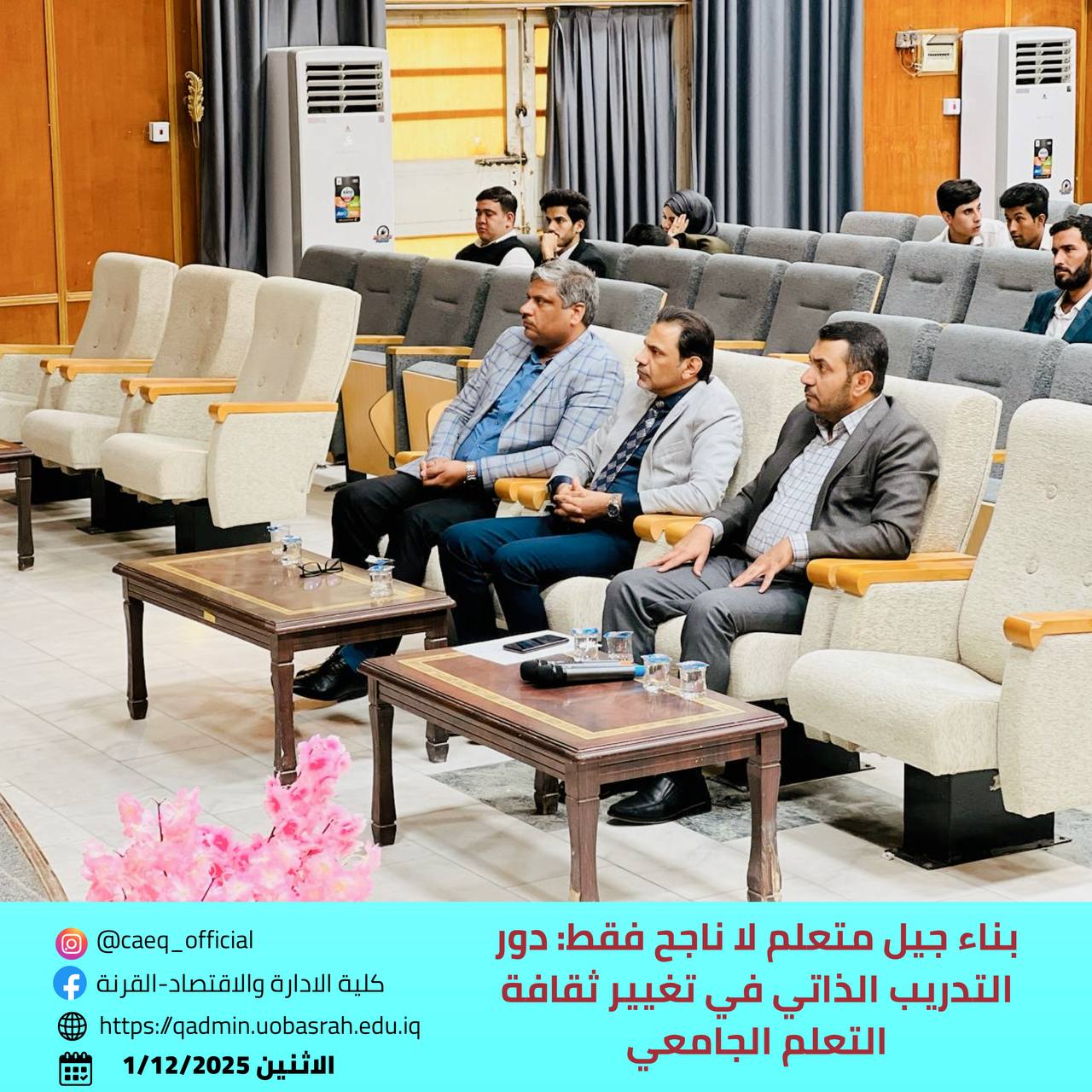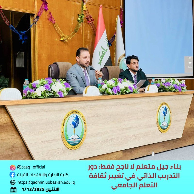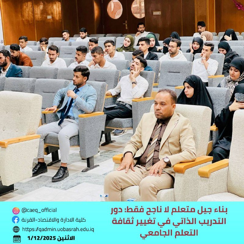 نظّمت كلية الإدارة والاقتصاد في القرنة، برعاية السيد رئيس جامعة البصرة الأستاذ الدكتور مهند جواد الأسدي، وبإشراف عميد الكلية الأستاذ الدكتور عدنان فرحان الجوراني، ندوة علمية بعنوان “بناء جيل متعلم لا ناجح فقط: دور التدريب الذاتي في تغيير ثقافة التعلم الجامعي”، وذلك يوم الثلاثاء الموافق 14/10/2025، على القاعة المركزية في الكلية.
