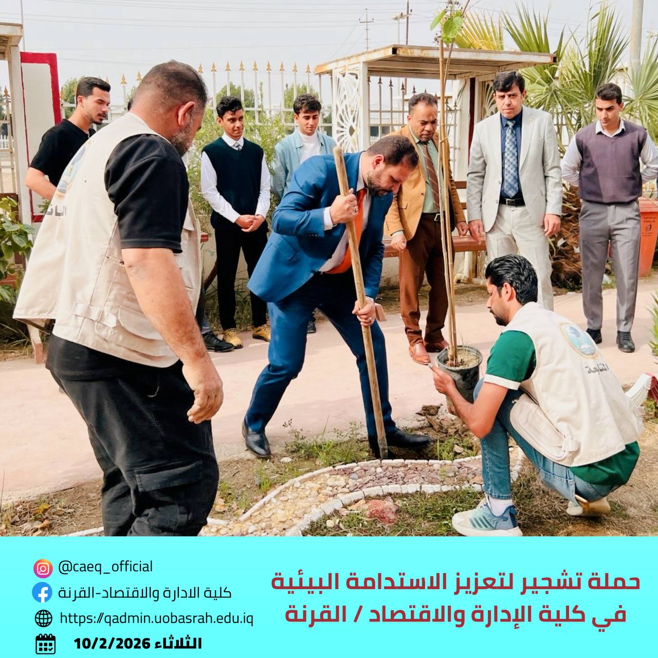 نظّمت كلية الإدارة والاقتصاد في القرنة حملة تشجير واسعة داخل أروقة الكلية وحدائقها، برعاية السيد رئيس جامعة البصرة الأستاذ الدكتور مهند جواد الأسدي، وبإشراف عميد الكلية الأستاذ الدكتور عدنان فرحان الجوراني، وبمشاركة عدد من تدريسيي ومنتسبي وطلبة الكلية.